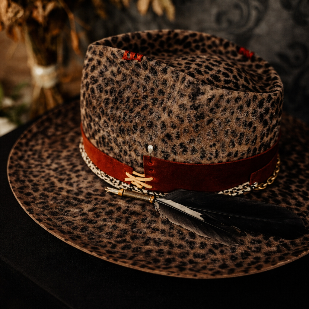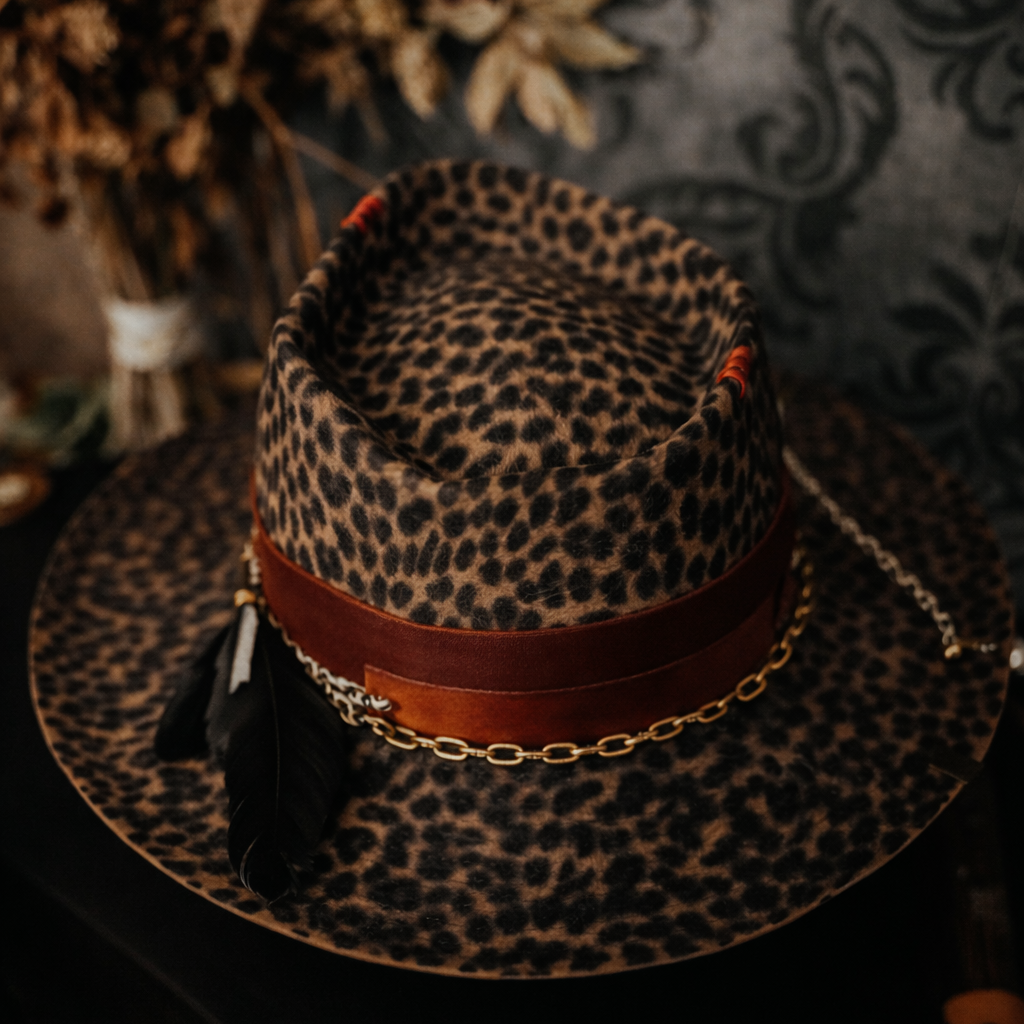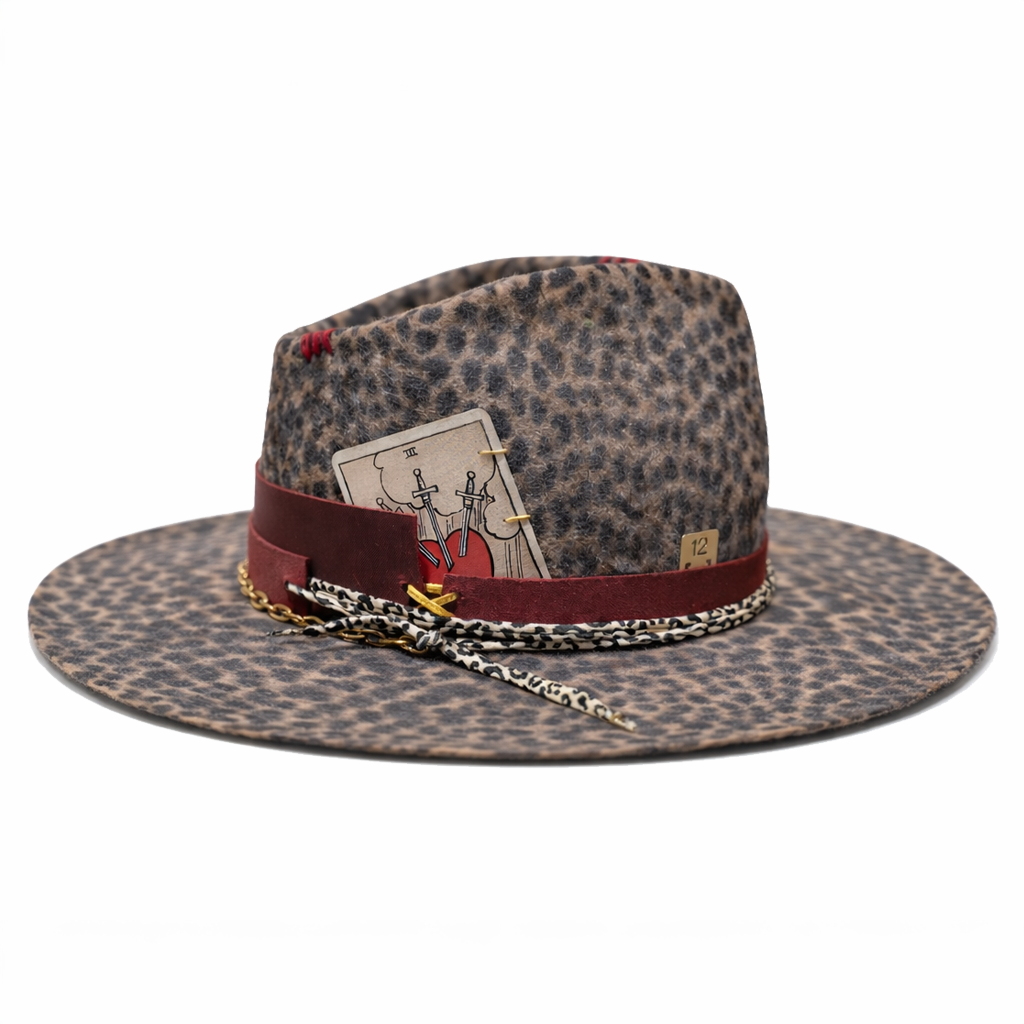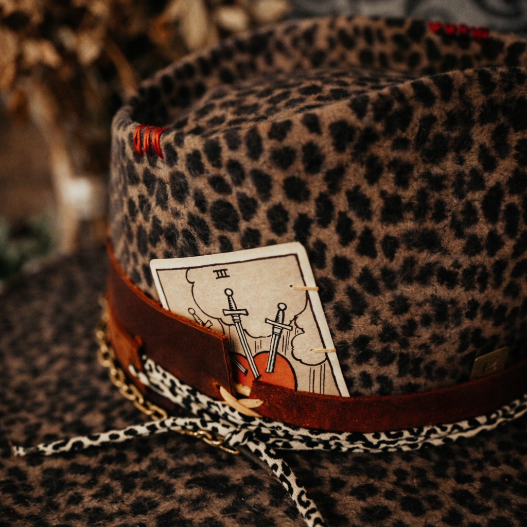 The Lovers v sobě nese ducha vášně a osudu vetkaného do každého detailu. Divoký vzor plsti působí živě, nespoutaně a plný pohybu, zatímco hluboká červená stuha obepíná korunu jako symbol oddanosti a intenzity. Ve stuze je zasunutá tarotová karta Milenců, která tiše vypráví příběh spojení — o dvou cestách, jež se protínají přesně v ten správný okamžik. Tento klobouk působí jako vzpomínka na setkání, které všechno změní, kde se náhoda promění v osud a zvědavost přeroste v něco hlubšího.